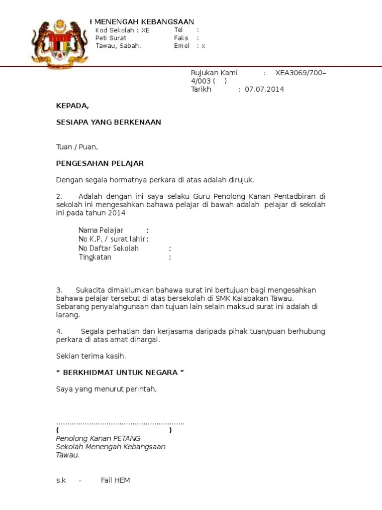 Surat Pengesahan Pelajar Sekolah - 2 - 11.03.2022 · bagi tujuan menulis kehadiran kursus pembelajaran kendiri melalui epsa, daripada surat tamat kursus terdapat tarikh tamat kursus.. Sebagai contoh kursus amalan 5 s, nilai jam kursus adalah 12 jam = 2 hari kursus. Justeru, jika terdapat perkara yang tidak dapat dielakkan seperti sakit atau urusan keluarga sehingga menyebabkan ketidakhadiran ke sekolah, anda bertanggungjawab untuk menulis surat sebagai … Dokumen yang perlu disertakan semasa pengesahan pendaftaran adalah seperti berikut: 09.03.2021 · jika berjaya, ibu bapa perlu membuat pengesahan pendaftaran di sekolah yang dipohon. 11.03.2022 · bagi tujuan menulis kehadiran kursus pembelajaran kendiri melalui epsa, daripada surat tamat kursus terdapat tarikh tamat kursus.